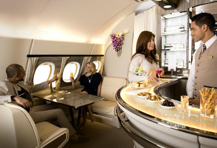 Уникальные характеристики самолета Верхние палубы всех 93 A380 в парке самолетов Emirates оснащены зоной отдыха Onboard Lounge, где в течение полета для клиентов первого класса и бизнес-класса профессиональный бартендер сервирует легкие закуски, коктейли, лучшие сорта вин и напитки премиальных марок. Эксклюзивно для клиентов первого класса в носовой части самолета расположены две просторные душевые комнаты с кожаной мебелью, подогреваемым полами и оптимально подходящей для полета косметической продукцией от SPA-бренда VOYA. Клиенты первого класса путешествуют в роскошных персональных каютах, салоны бизнес-класса оснащены креслами с персональным мини-баром, раскладывающимися в кровать, а эконом-класс предлагает больше пространства и комфорта, благодаря особой конструкции фюзеляжа и кресел. Независимо от класса, клиентам доступны более 2500 каналов, Wi-Fi, роуминг данных и мобильная связь. |